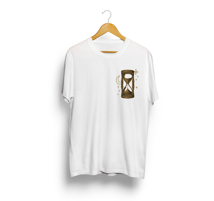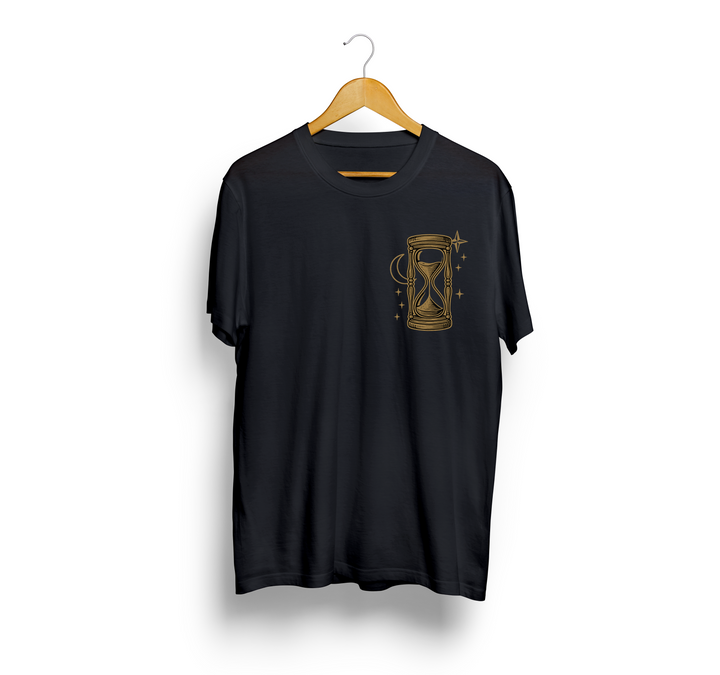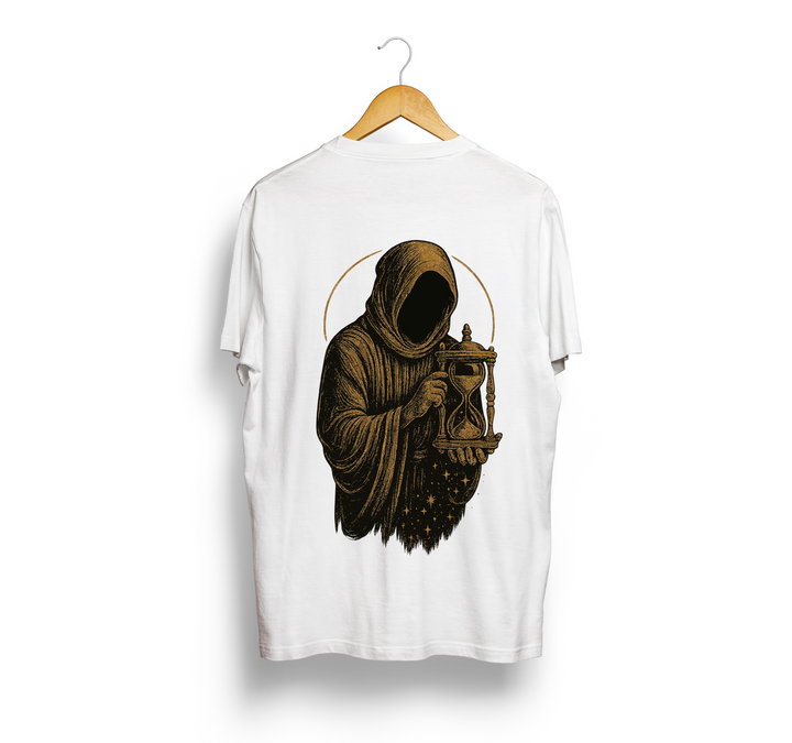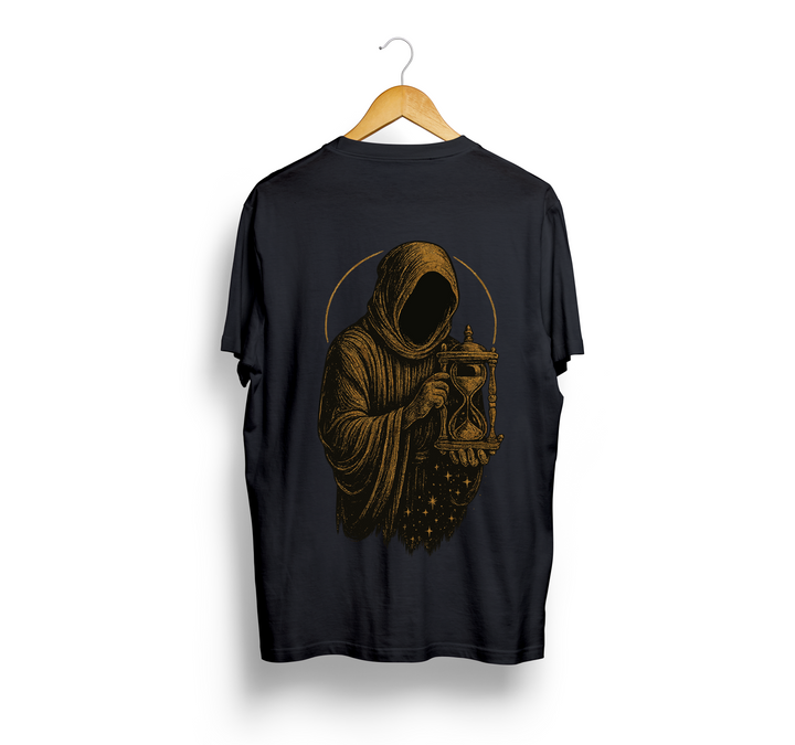 Dale un giro profundo a tu estilo con esta playera Guardián del Tiempo, un diseño que representa el paso de los segundos con un toque espiritual y visualmente impactante. El reverso de la camiseta muestra a una figura en túnica sosteniendo un reloj de arena dorado, mientras que el frente presenta una versión estilizada del mismo reloj entre estrellas y lunas.