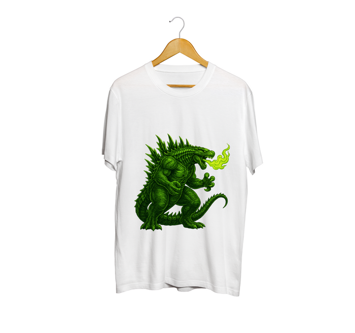 Impón tu estilo con esta playera Kaiju verde, un monstruo clásico inspirado en el cine japonés que lanza fuego radiactivo. La ilustración detallada en tonos neón resalta tanto en prendas negras como blancas gracias a la impresión DTF de alta definición.